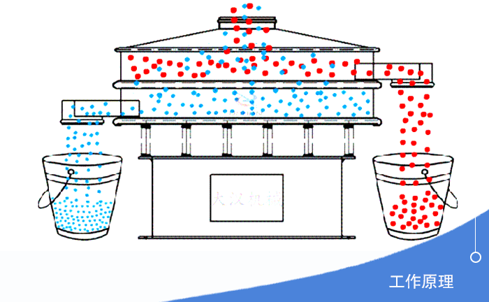 不銹鋼旋振篩分機采用直立式電機作激振源,當篩機啟動后,電機上、下兩端安裝的偏心重錘,將電機的旋轉運動轉變為水平、垂直、傾斜的三次元運動,再把這個運動傳遞給篩面。在此過程中,小于篩面孔徑的物料通過篩孔落到下層,成為篩下物,大于篩面孔徑的物料經連續跳躍運動后從排料口排出,用戶通過調節上、下兩端重錘的相位角,可以改變物料在篩面上的運動軌跡,從而設計實現對物料的篩分。