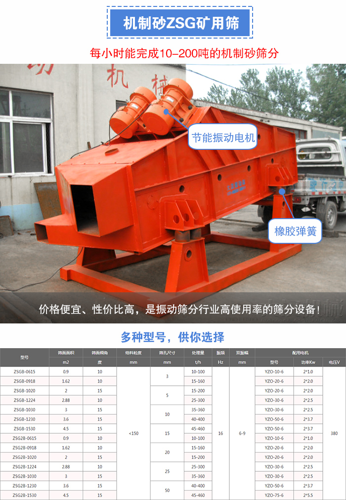 ZSG礦用振動篩是我公司自主研發(fā)得一種新型,高效的篩分設備,主要用于冶金,礦山,煤炭,建材等大規(guī)模生產線使用。每小時能完成10-200噸的機制砂篩分,采用能耗低振動電機作為振動源,橡膠彈簧支撐并隔振,處理量大篩分效率高,篩網有較大的安裝傾角,拼塊,更換方便,使用壽命長。